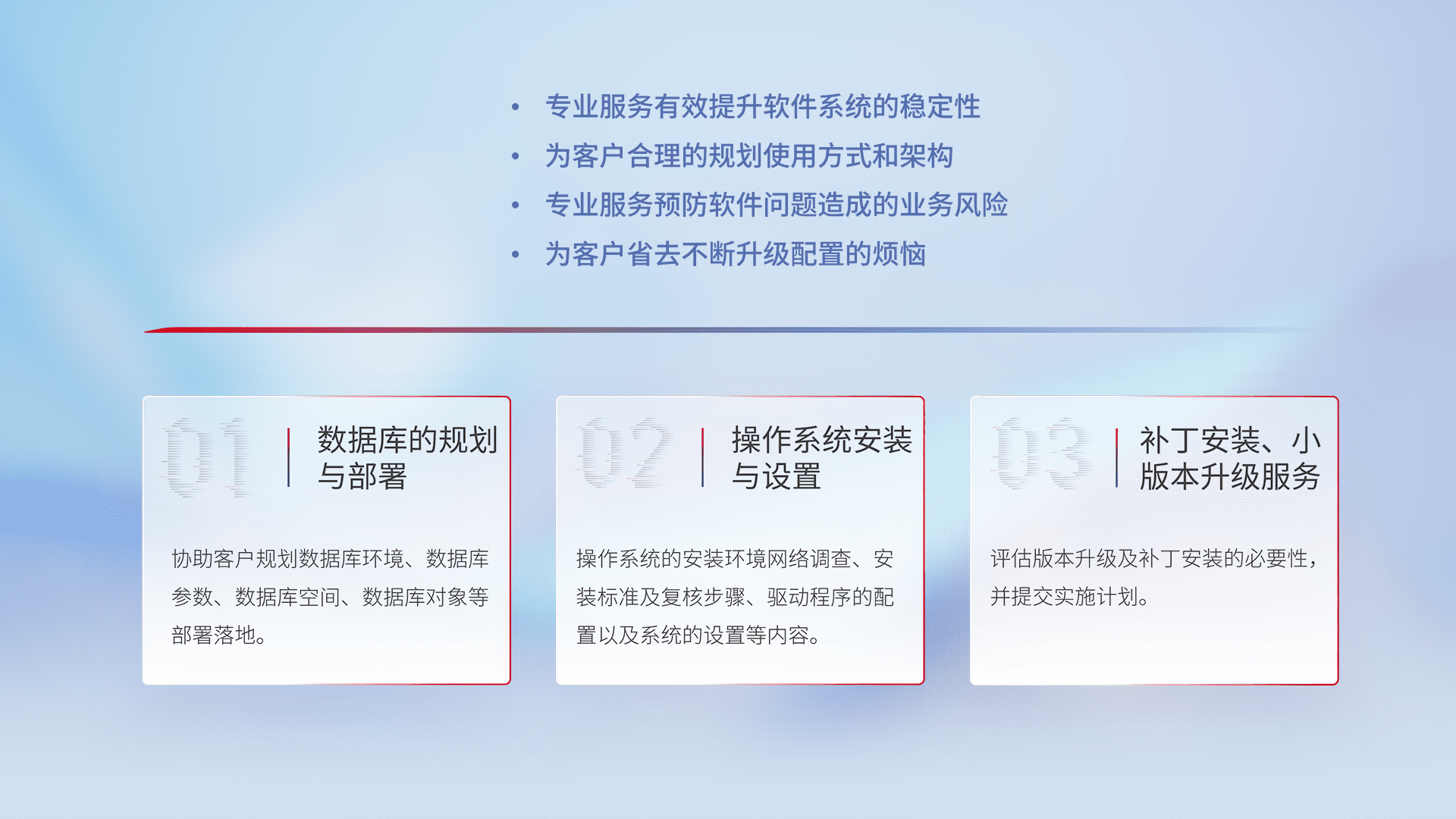 为客户提供软件规模升级、、快速部署、、、、按需配置的专业服务,,,,从数据库的规划与部署到操作系统的安装与设置,,,,再到补丁安装和小版本升级提供支持。。